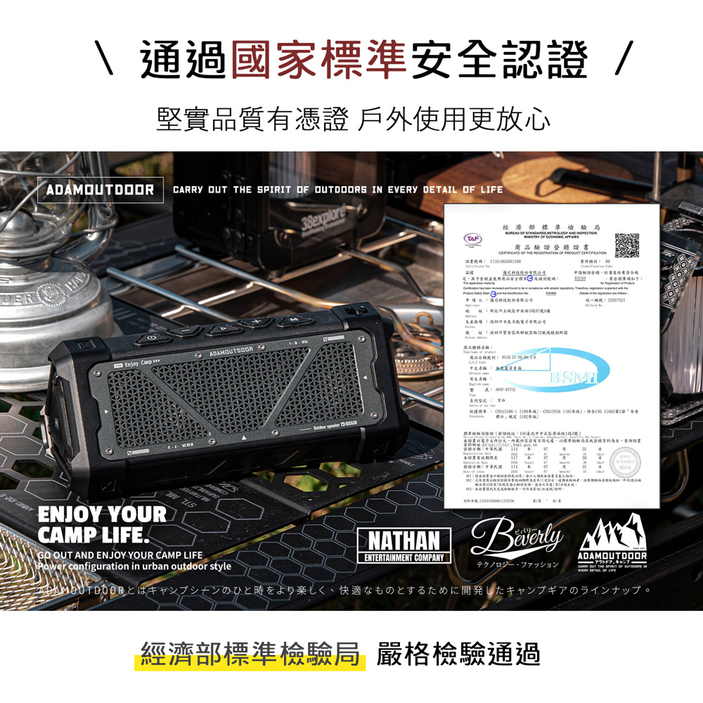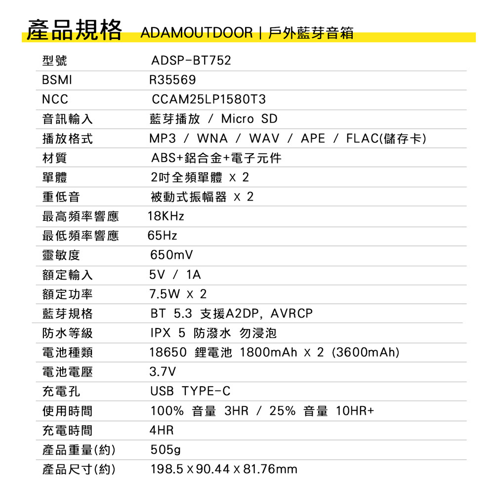 額定輸入:5V / 1A 額定功率:7.5W X2 平均輸出功率:15W 信噪比:80dB 靈敏度:650±50mV 失真率:<1% 頻率響應:65~18KHz 阻抗:4R音訊輸入:藍芽播放 / Micro SD 播放格式:MP3 / WNA / WAV / APE / FLAC(儲存卡) 材質:ABS+鋁合金+電子元件 單體:2吋全頻單體*2 重低音:被動式振幅器*2 藍芽規格:BT 5.3 支援A2DP, AVRCP 防水等級:IPX 5 防潑水 勿浸泡 電池種類:18650 鋰電池 1800mAh X 2 (3600mAh) 電池電壓:3.7V 充電孔:USB TYPE-C 使用時間:100% 音量 3HR / 25% 音量 10HR+ 充電時間:4HR 產品重量:505g 產品尺寸:198.5X 90.44X 81.76 MM 產地:中國 NCC:CCAM25LP1580T3 BSMI:R35569