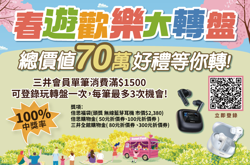 - 參與活動資格:2026/04/01~2026/04/30 單筆消費滿$1,500之發票或三井3C專櫃的交易單號,註冊三井3C APP會員&升級為VIP!