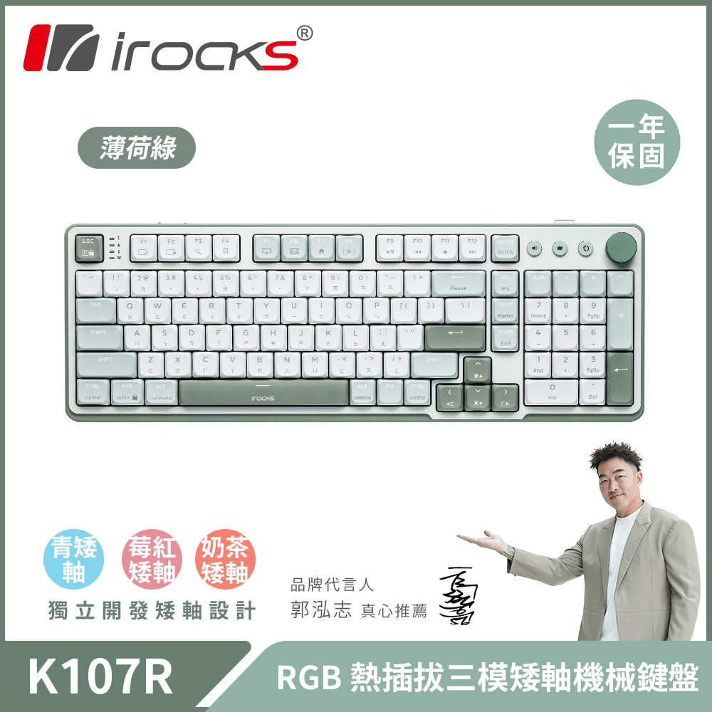 【iRocks】K107R 無線三模機械鍵盤|薄荷綠 莓紅矮軸