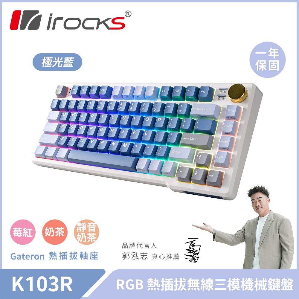 【iRocks】K103R 機械式 RGB 鍵盤 極光藍|靜音奶茶軸